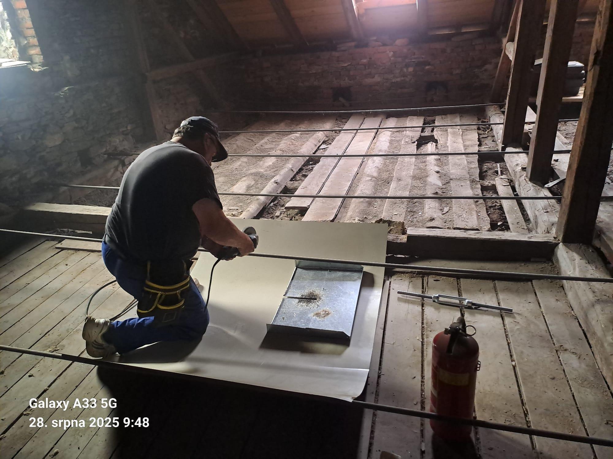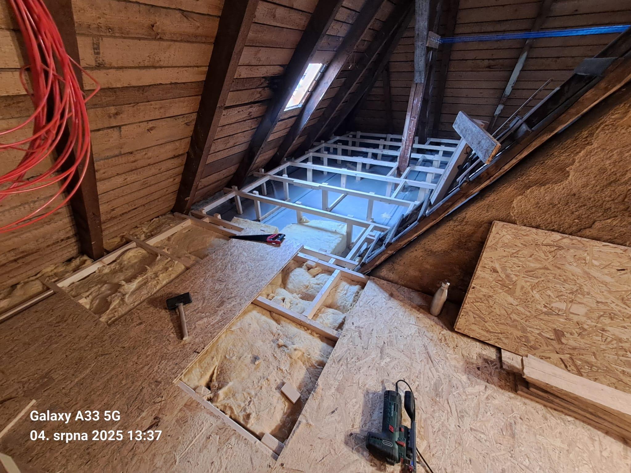 19. srpna 2025Provádíme zatepleni půdních prostor mineralni vatou 400mm a pote dochází k zaklopu OSB deskami na námi vytvořenou dřevěnou konstrukci. ...